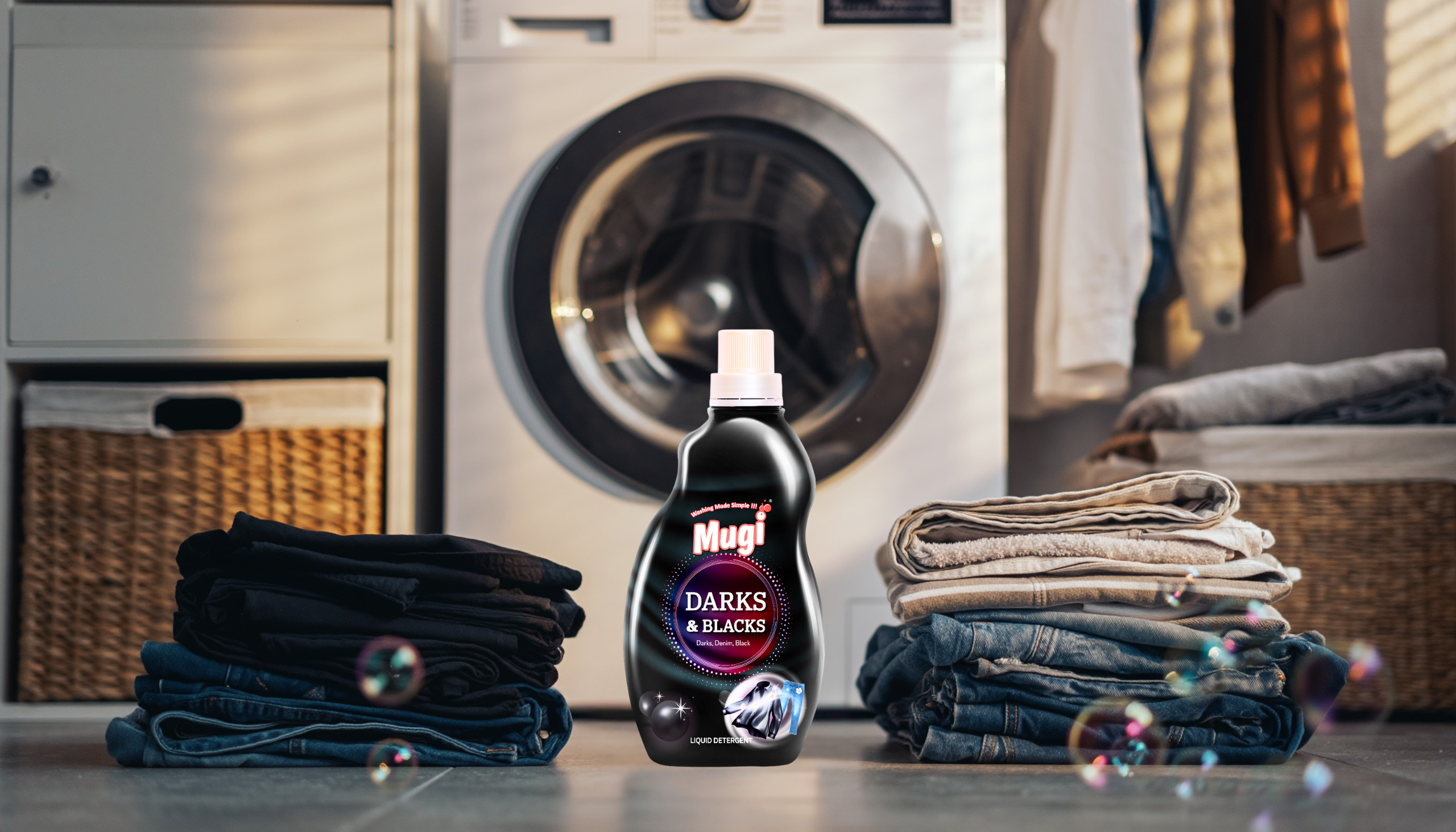 Mugi Darks & Blacks is a specially formulated low-foam, colour-protect formula to preserve richness in dark fabrics, reduce fading and rinse clean without residue.