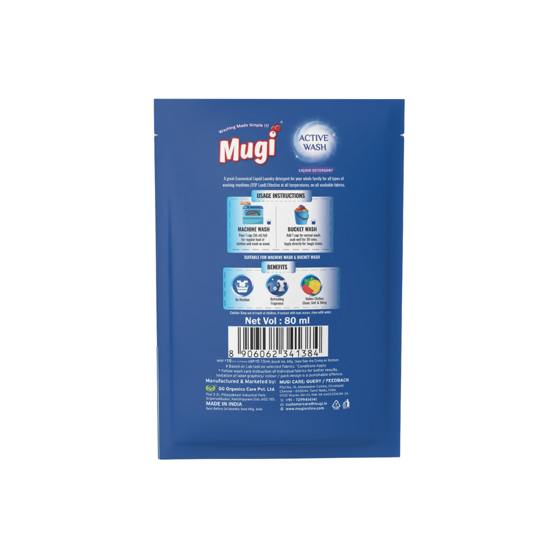 Mugi Active Wash Liquid Detergent – 80ml Pouch ( Pack of 20)
