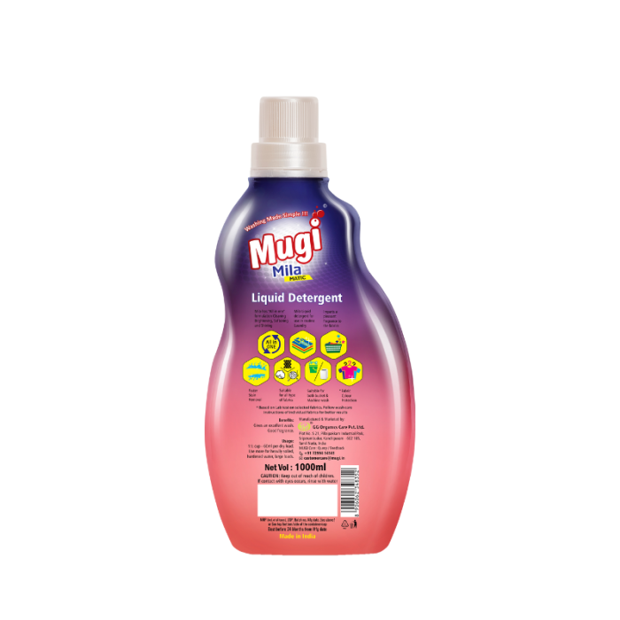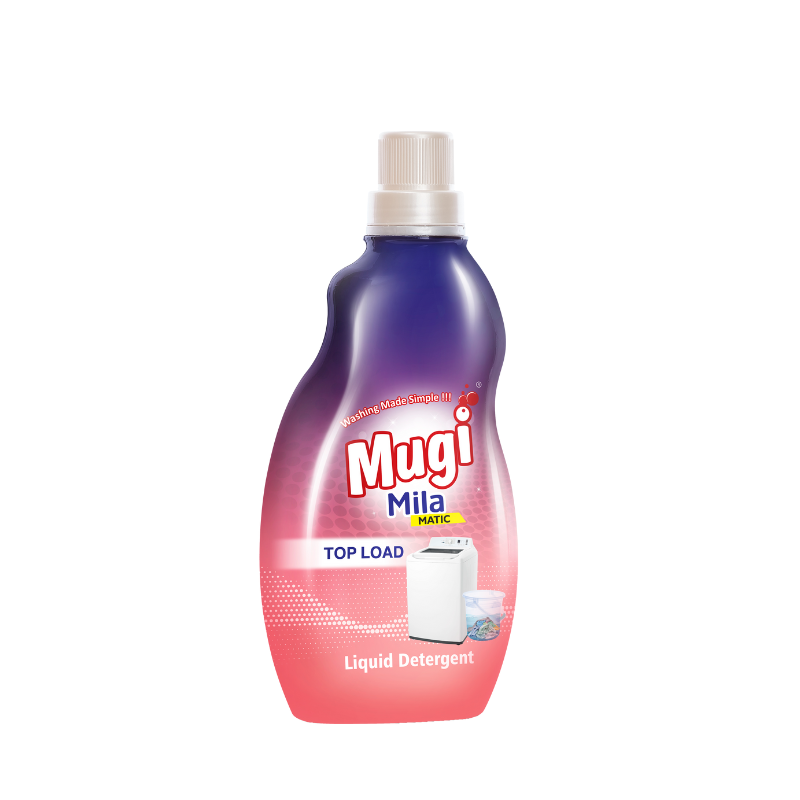 Mugi Superior dispersion properties. Prevents redeposition and suspends particles. Active molecules for brightening, softening and shining. Active liquid for complete economical laundry. Fresh pleasing fragrance to the fabrics.