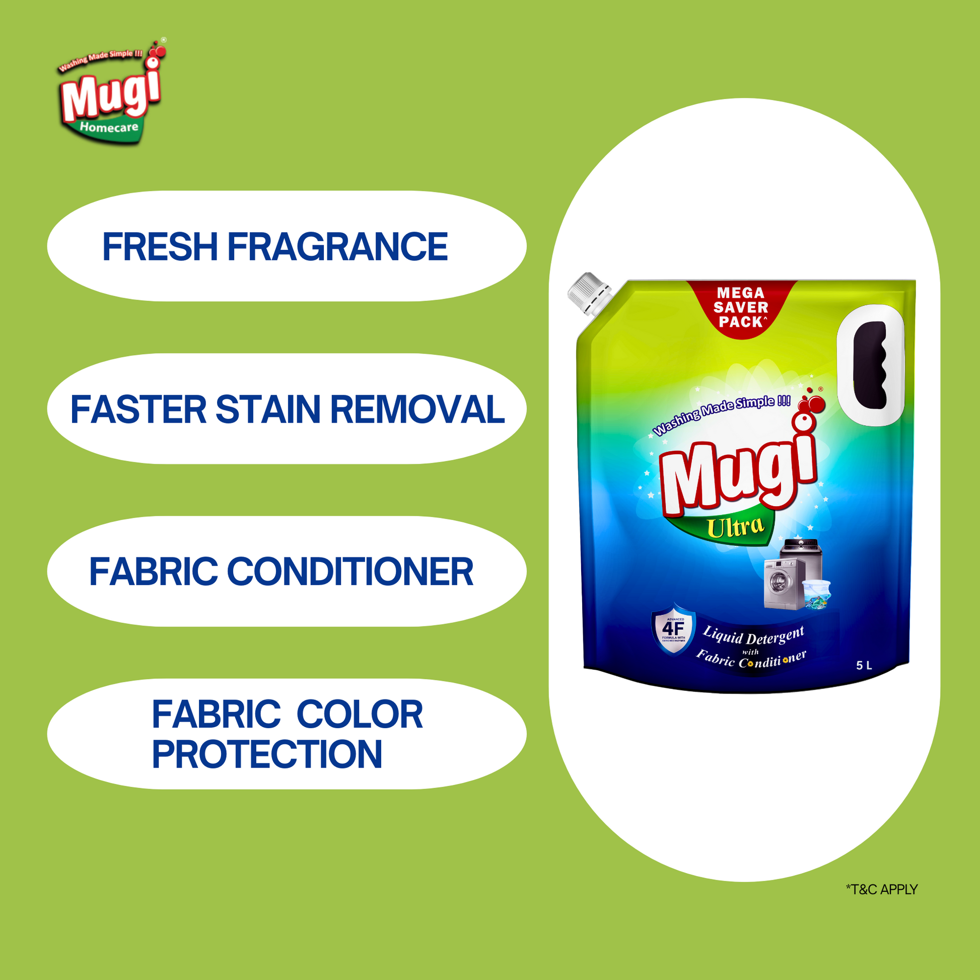 Mugi Ultra Liquid Detergent is an ideal choice for households seeking an effective, economical, and environmentally responsible laundry solution. Its powerful formula ensures clean, soft, and fragrant clothes with minimal effort.